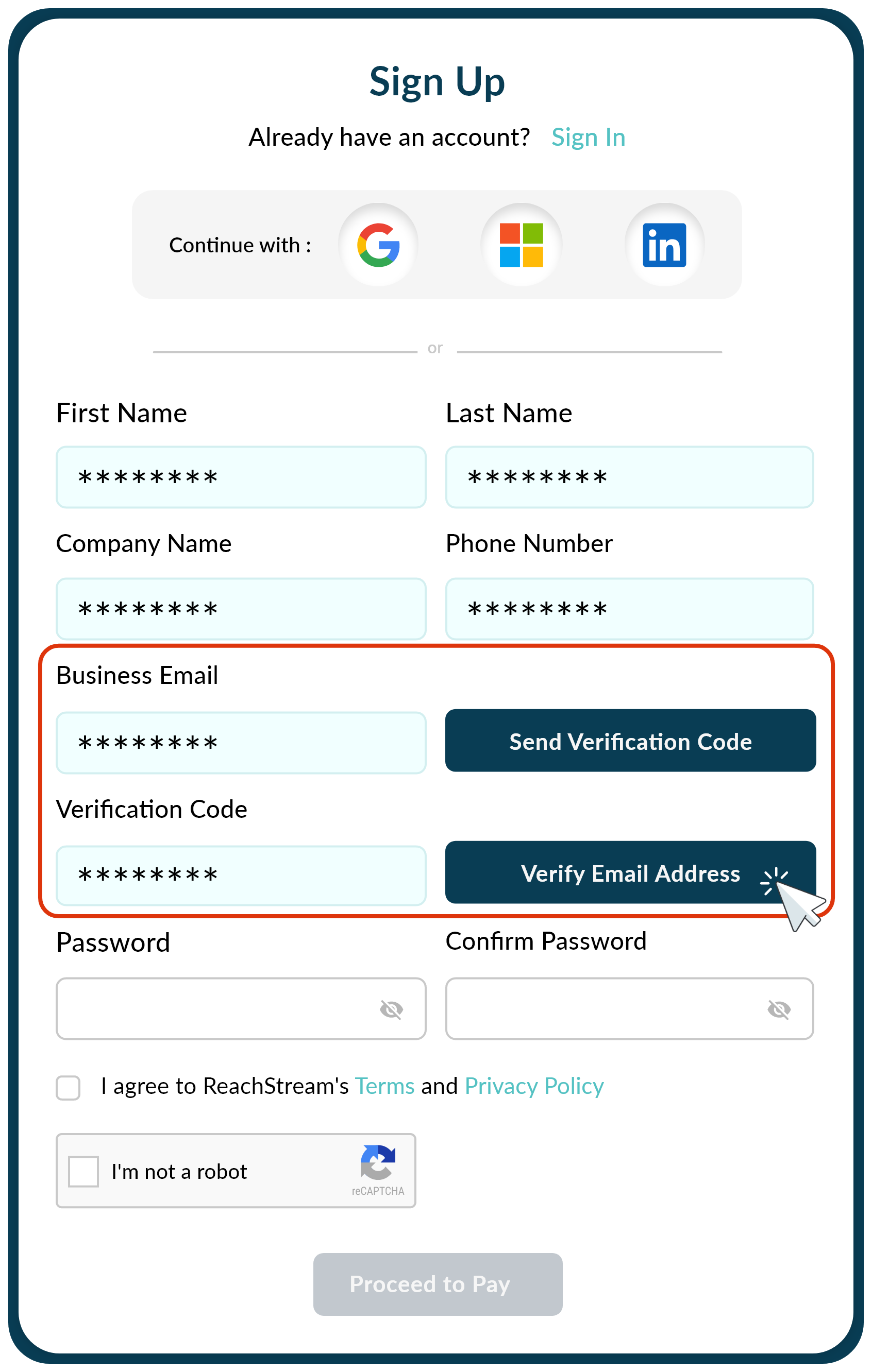 - Enter the code in the sign-up window – Return to the ReachStream sign-up page and enter the verification code in the required field.