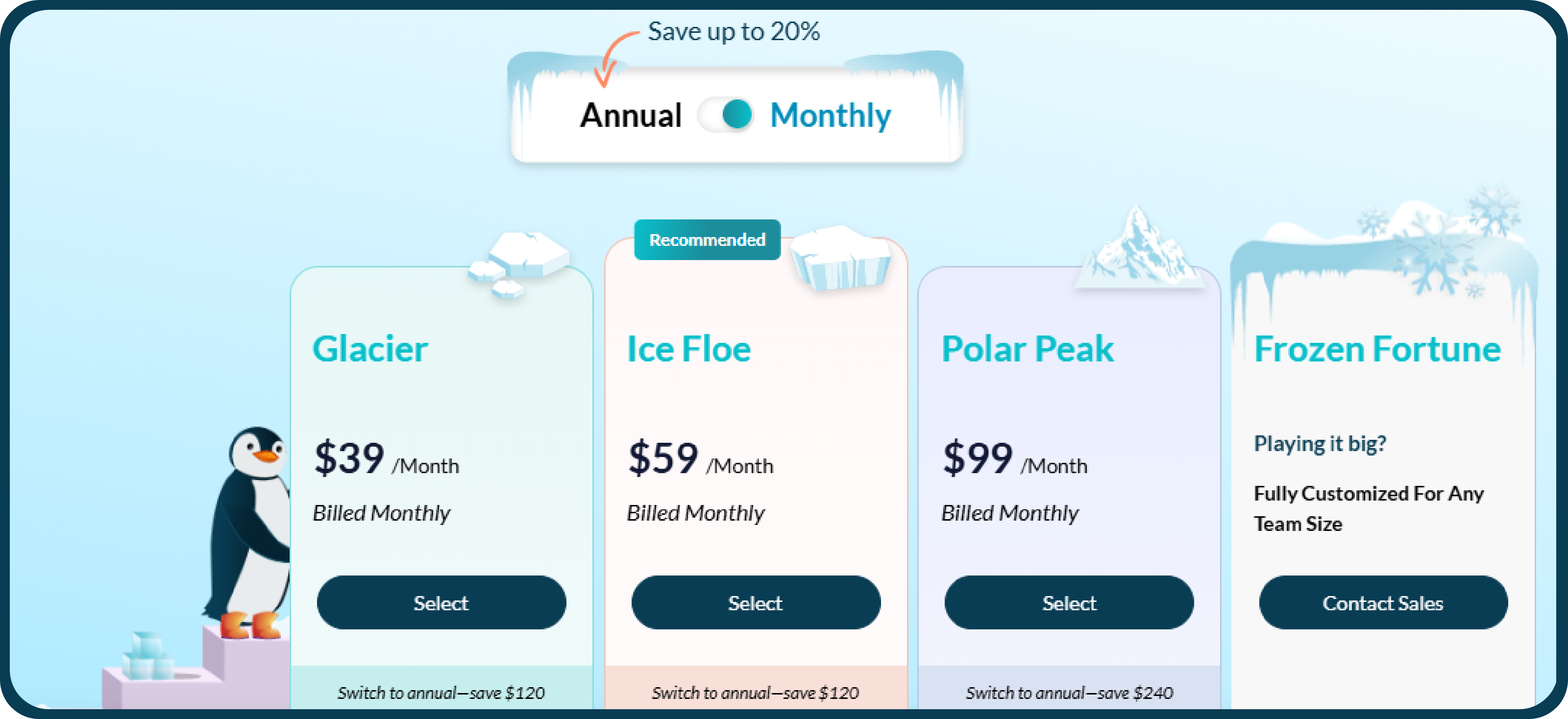- Ice Floe Plan – $59/month → 10,000 exports/month
