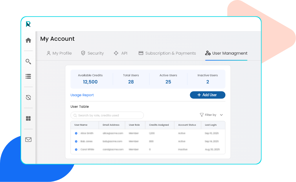 It enables organizations to add and manage multiple users, assign role-based permissions, allocate and control credit usage, and track user-level activity. The system is designed to support structured collaboration, transparency, and enterprise-grade security for sales, marketing, and data teams.